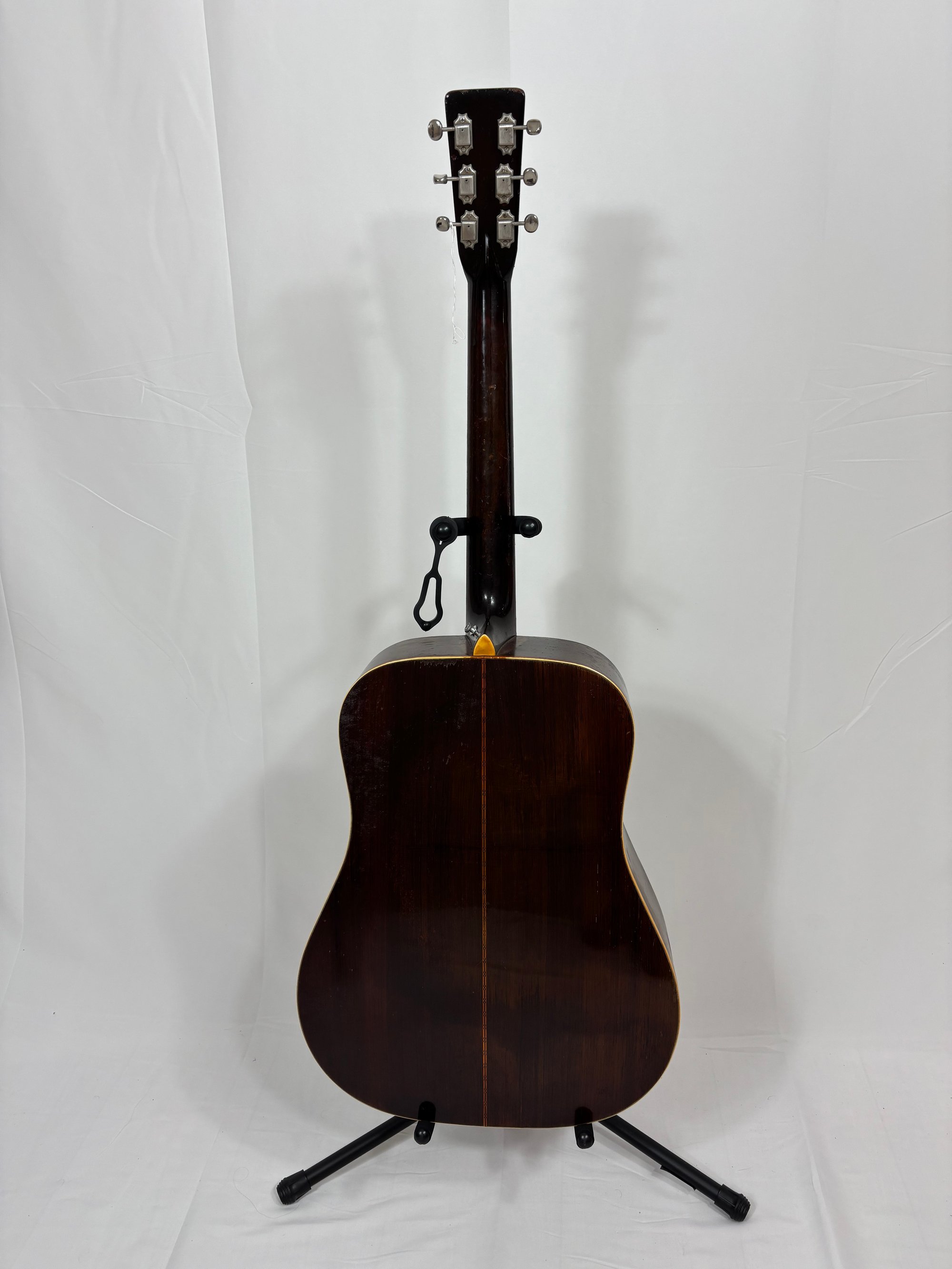 At the time of this listing a fresh neck reset and bridge re-glue have taken place. Great sounding old D-28 that appears to have been to hell and back! Other than a small b-string crack, this guitar has survived crack-free. Some old overspray near places of extreme finish wear and a touch on back of neck. Killer vibe on this D-28!